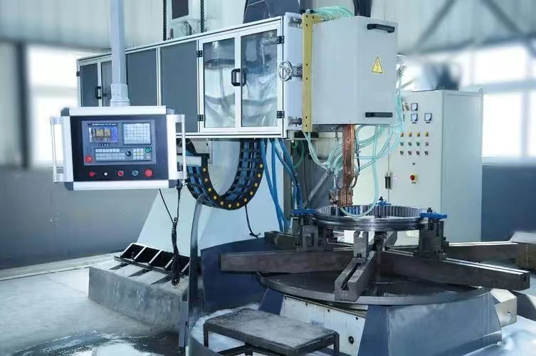 (2)單工位雙淬火變壓器感應(yīng)器組立式回轉(zhuǎn)支承,該回轉(zhuǎn)支承它采用一個立式升降機構(gòu),兩套淬火變壓器感應(yīng)器組.一套用以淬凸輪,另一套用以淬軸頸。兩套感應(yīng)器均是雙孔的,如網(wǎng)兩套淬火變壓器感應(yīng)器組是相互呈90。交叉,共對著回轉(zhuǎn)支承淬火機床感應(yīng)設(shè)備的雙中心線。為此.一套感應(yīng)器的兩個孔是左右配置,而另一套感應(yīng)器的二個孔呈前后分布以上兩種回轉(zhuǎn)支承淬火機床感應(yīng)設(shè)備適用于不是大批量生產(chǎn)的,因為它是采用按順序分段一次淬火方式,但對中頻電源來說,由于采用兩個工位交替加熱,其暫載率是較高的。